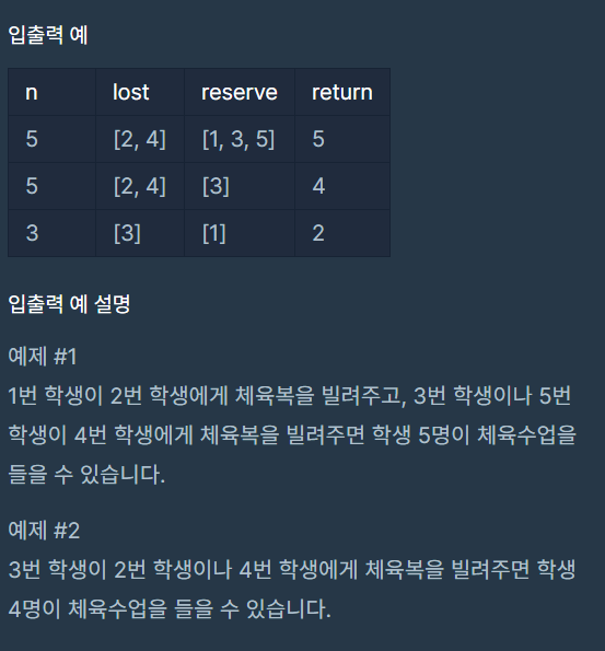 2. 잃어버린 번호와 여벌을 가지고 있는 변수 lost와 reserve를 인덱스로 가져와 해당값을 -1, +1 해줌으로써 쉽게 변환 --------- [1,1,1,1,1]에서 [2,4]를 받아와 -1해줌으로써 ->[1,0,1,0,1]형태로 처리, [1,3,5]를 받아와 +1을 해 [2,0,2,0,2] 형태로 만듬