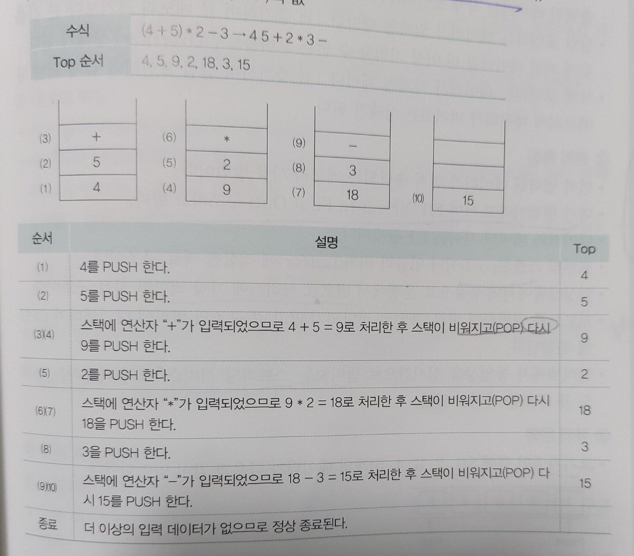 1. (4 + 5) * 2 - 3 2. (4 5 +) * 2 - 3 3. (4 5 + 2 * )-3 4. --> 4 5 + 2 * 3 - def Calculate(tokens): stack = [] for token in tokens: if token == "+": stack.append(stack.pop() + stack.pop()) elif token == "-": stack.append(-(stack.pop()- stack.pop())) elif token == "*": stack.append(stack.pop() * stack.pop()) elif token == "%": rv = stack.pop() stack.append(stack.pop()/rv) else: stack.append(int(token)) return stack.pop() print(Calculate(["4","5","+","2","*","3","-"]))2. 큐(Queue)의 특징