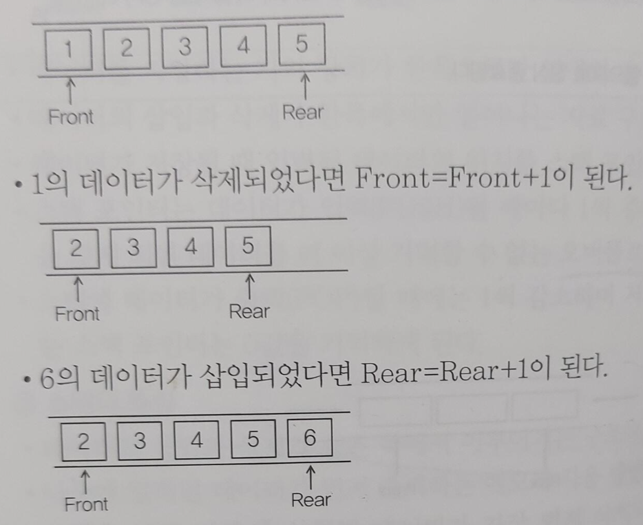 - 데이터가 입력된다면 REAR+1, 데이터가 삭제될 때마다 front+1