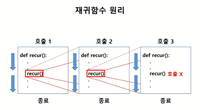 재귀함수 사용이유-코드의 간결화 및 변수 사용 최소화하기 위해서이다. 조건문을 활용하여 재귀함수 종료조건을 삽입해 주어야 한다.