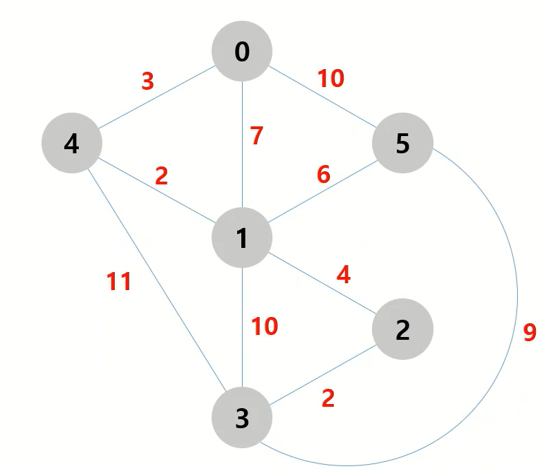 0 1 2 3 4 5 True False False False True False 0에서 시작할 때 갈 수 있는 노드는 4번, 1번, 5번 노드이다. 여기서 이동할대 최소비용으로 이동할 수 있는 4번 노드를 선택한다.