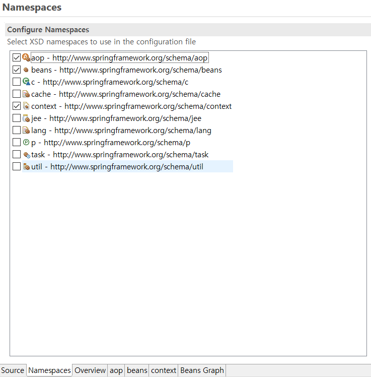 <dependencies> <dependency> <groupId>org.springframework</groupId> <artifactId>spring-context</artifactId> <version>4.3.30.RELEASE</version> </dependency> <dependency> <groupId>org.projectlombok</groupId> <artifactId>lombok</artifactId> <version>1.18.20</version> </dependency> <!-- AOP 적용시에 필요한 추가 library - byte code를 실시간 동적으로 자동 생성해주는 기능의 library --> <dependency> <groupId>cglib</groupId> <artifactId>cglib</artifactId> <version>2.2.2</version> </dependency> <!-- AOP 기능의 framework - spring이 AOP 기술을 활용해서 spring 스럽게 활용 --> <dependency> <groupId>org.aspectj</groupId> <artifactId>aspectjweaver</artifactId> <version>1.7.3</version> </dependency> </dependencies>✅aop.xml의 Namespaces에서 필요한 스펙들 추가해준다(aop, **beans, context)