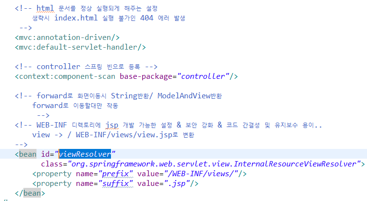 💢보안을 위해 WEB-INF/Views에 들어가 있는 jsp를 사용하기 위해서는 아래 그림과 같이 dispatcher-servlet에 viewResolver를 통해 prefix 와 suffix를 설정해 주어야 한다. 이외에도 mvc사용할때 필요한 것과 controller를 빈으로 지정하는 설정도 넣어 주어야 한다.