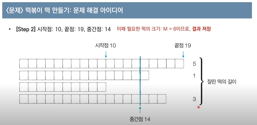 잘린떡의 길이는 2밖에 되지않아 손님이 요구했던 6만큼 충족시키지 못했다. 따라서 끝점을 중간 -1한 값을 적용시킨다.